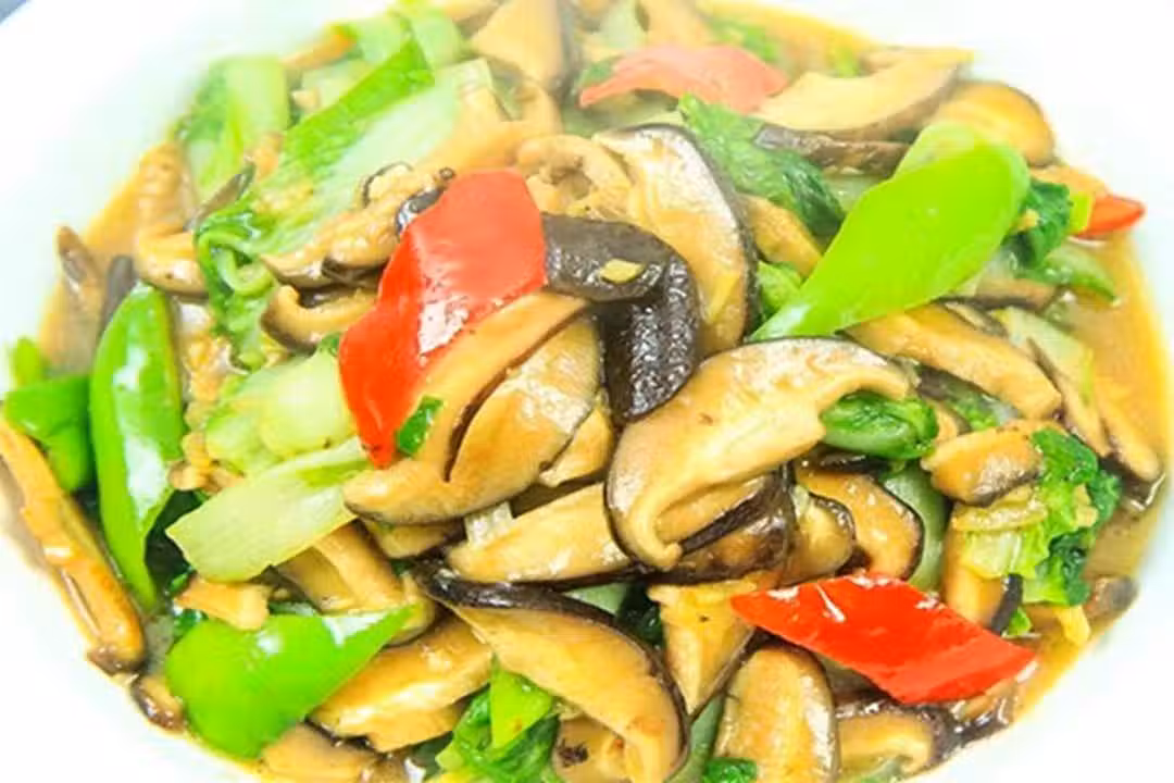 4.然後倒入小白菜大火翻炒至斷生,加入雞粉1克,勾入一點水澱粉,快速收一下湯汁,最後倒入青紅椒片翻炒幾下,美味即成。