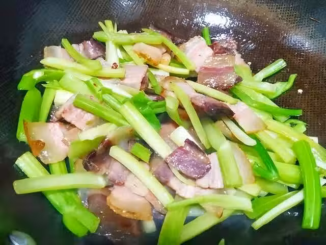 4.用大火快速翻炒30秒。這一步給臘肉腌制入味。然後再把準備好的芹菜加進來。用大火快速翻炒一分鐘。一分鐘後再放入生抽,老抽。調色調味滴入幾滴香油快速翻炒均勻就可以出鍋吃了。
