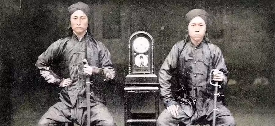 這兩名武士小衣襟短打扮,不像是官府清兵,手中刀劍細長且直,也不像是清兵常用的反佩腰刀,右側這腰間還別著一把短槍。那時的擺拍照片里,旁邊總愛擺些時鐘、水煙什麼的物件,可能是炫富的一種方式。