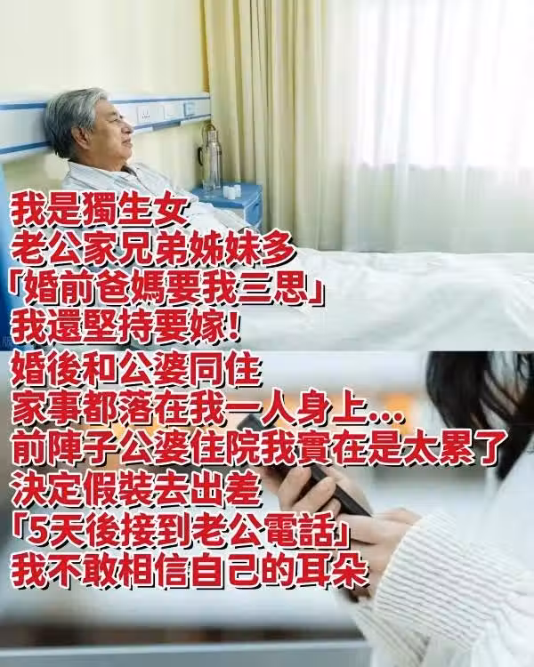 我是獨生女,老公家兄弟姊妹多「婚前爸媽要我三思」我還堅持要嫁! 婚後和公婆同住,家事都落在我一人身上...前陣子公婆住院我實在是太累了,決定假裝去出差「5天後接到老公電話」我不敢相信自己的耳朵😱