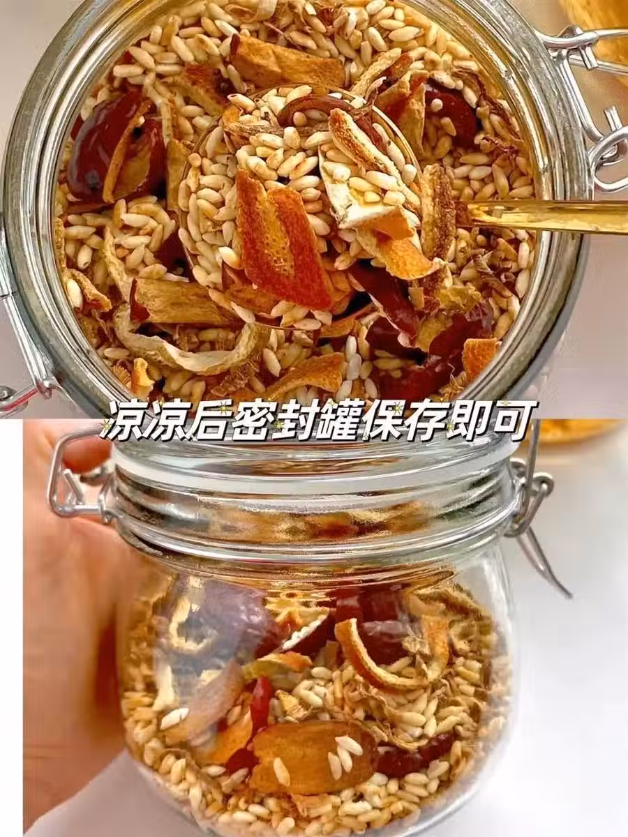 炒好以後放涼,在裝入密封罐里。想喝的時候挖2勺,開水泡一會兒就可以喝了。這一瓶夠我喝一個月。平時油膩的東西吃多了,來一杯紅棗陳皮姜米茶特清爽。