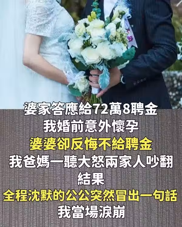 婆家答應給72萬8聘金,我婚前意外懷孕「婆婆卻反悔不給聘金」,我爸媽一聽大怒兩家人吵翻! 結果「全程沉默的公公突然冒出一句話」我當場淚崩…🥹