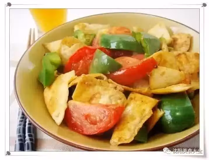 2、起鍋熱油爆香薑絲放入白豆腐乾煎至兩面金黃色再放入綠菜椒加少許清水翻炒最後放入西紅柿加鹽、蘑菇精調味即可出鍋