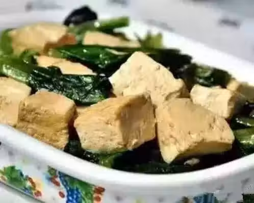 食材:油麥菜,北豆腐,油,鹽,生抽
