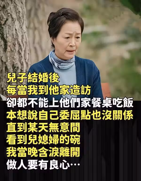 兒子結婚後,每當我到他家造訪,卻都不能上他們家餐桌吃飯,本想說自己委屈點也沒關係。直到某天無意間「看到兒媳婦的碗」,我當晚含淚離開:「做人要有良心~」