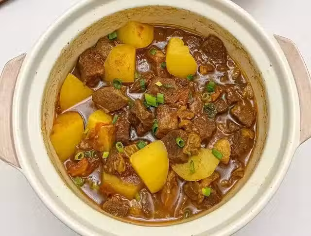 5、燉好後轉入砂鍋中,加入大塊西紅柿和土豆,加適量鹽,中小火20分鐘,開蓋大火收汁,出鍋撒上蔥花點綴。