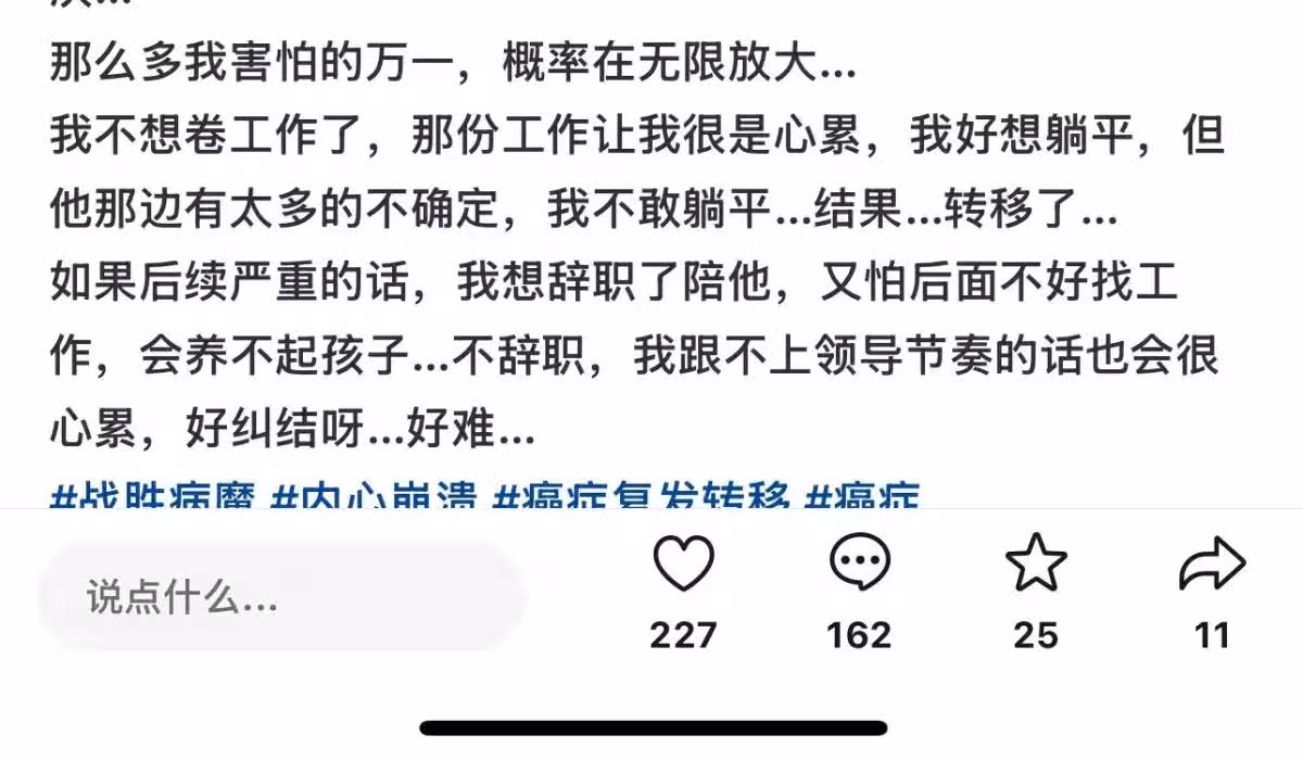何老師情緒低落,他深知,轉移就意味著晚期了,雖然嘴上對妻子說:「大不了轉移了又切了就是」,但他自己說得都沒有信心。