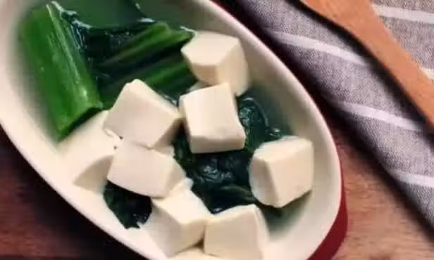 b.在鍋中加入水和薑片,加入芥菜煮至顏色變得鮮艷,加入豆腐再煮3分鐘,最後加入適量鹽調味,即成。