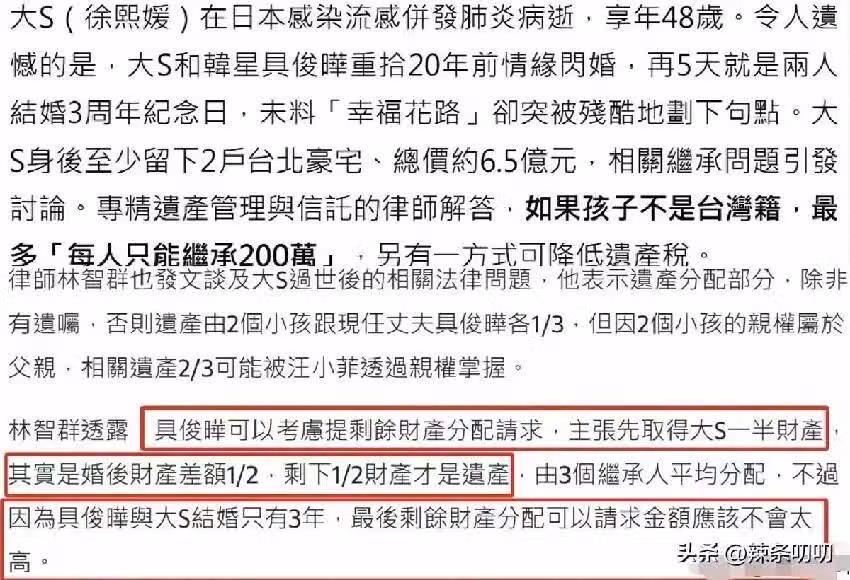 具俊燁成大贏家!大S已火化留下6.5億遺產,疑似分成三份,孩子可能分200萬