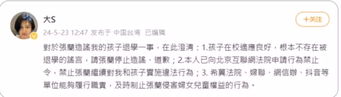 這起事件讓人意外想起,大S生前曾在去年5月底於微博發文,嚴正要求張蘭停止散布關於孩子退學的不實言論,「孩子在校適應良好,根本不存在被退學的謠言,請張蘭停止造謠、道歉」。她更進一步向北京網際網路法院申請行為禁止令,要求制止張蘭對她和孩子的違法行為。