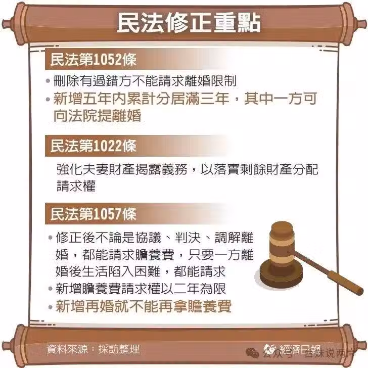 這些聲音逐漸匯聚成推動法律改革的浪潮。 2025年2月20日,台灣「行政院」正式通過《民法》修正草案,其中最引人注目的條款便是:再婚者將不再享有前配偶贍養費請求權。這一變革被法律界稱為「乾淨的分手」原則,旨在避免當事人因多重婚姻關係陷入經濟糾葛。 現行法律中,若一方「有過錯」(如出軌、家暴),另一方不得主動提出離婚,這一條款被批評為「對無過錯方過於嚴苛」。