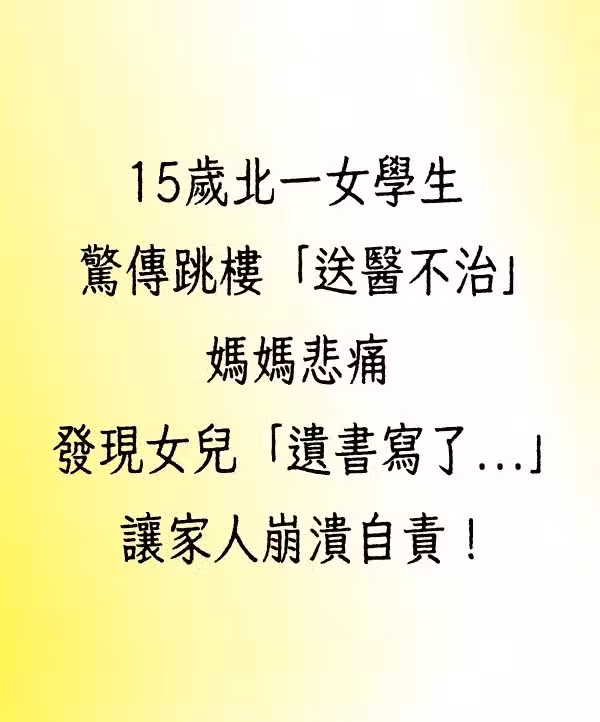 快訊/15歲北一女學生驚傳跳樓「送醫不治」!媽媽悲痛發現女兒「寫遺書了...」
