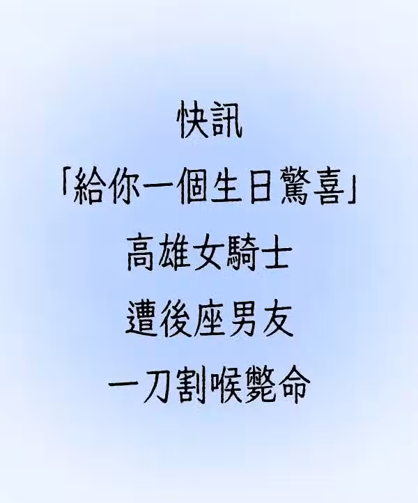 恐怖情殺!高雄市一名女子騎機車載男友,豈料,說要給她一個生日驚喜的男友,竟持刀從後方對女子割喉,一刀濺血斃命。