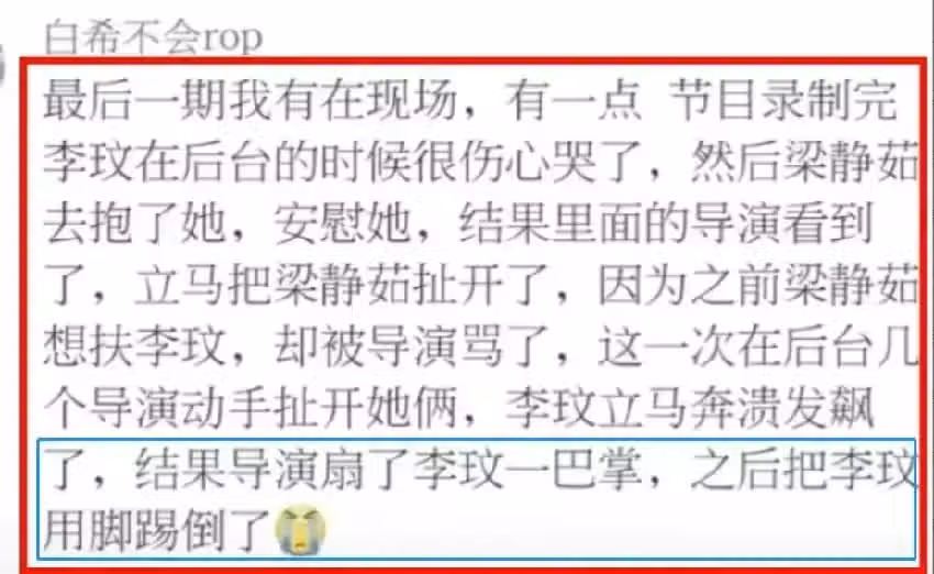 值得一提的是,還有現場觀眾爆料過,梁靜茹在攙扶了李玟之後,引發了節目組的不滿,一行人似乎還在後台吵了起來,李玟疑似遭到了導演掌摑。
