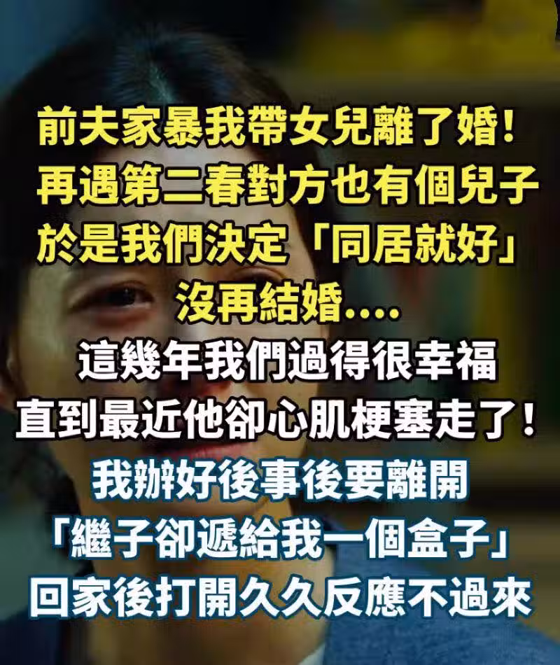 前夫家暴我帶女兒離了婚!再遇第二春「對方也有個兒子」,於是我們決定「同居就好」沒再結婚…這幾年我們過得很幸福,直到最近他卻「心肌梗塞突然走了」!我辦好後事後要離開「繼子卻遞給我一個盒子」我回家後打開久久反應不過來...