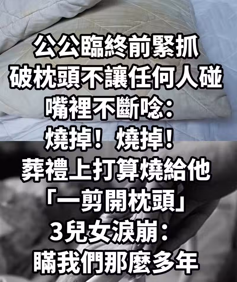 公公臨終前「緊抓破枕頭不讓任何人碰」嘴裡不斷念:燒掉!燒掉! 葬禮上打算燒給他「一剪開枕頭」3兒女淚崩:瞞我們那麼多年...