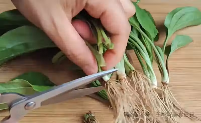 利用煮綠豆的這 10 分鐘時間,我們來處理車前草。將從野外採挖回來的車前草放在水龍頭下,簡單沖洗一下表面的泥土。然後,用剪刀把車前草根部的位置剪掉。根部通常比較老,而且容易藏污納垢,剪掉之後清洗起來會更加簡單快捷。