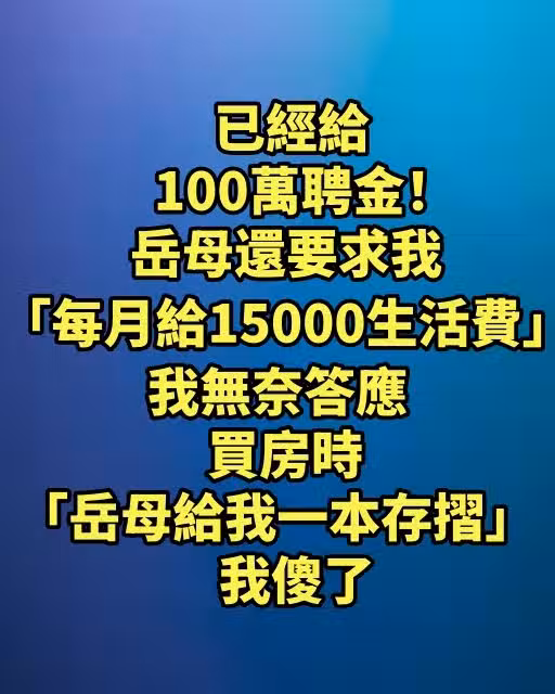 但我一看存摺上的金額愣住了,真的是300萬。「你們的聘金錢,以及這些年我跟你要的生活費,我都給你們存著呢。