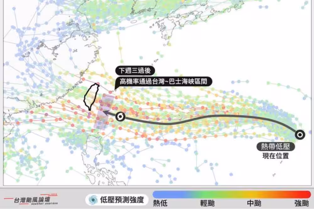 氣象粉專「台灣颱風論壇|天氣特急」在臉書發文指出,氣象署預測路徑從巴士海峽通過,日本氣象廳則預估直撲台灣。兩者差別主要就在太平洋高壓的強弱,如果高壓偏強,就可能南壓走巴士海峽;如果高壓沒那麼強,路徑就會趨向台灣。