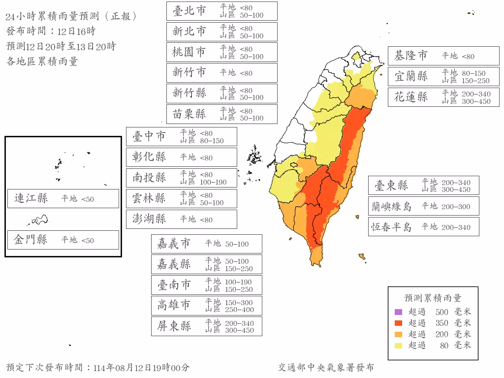 至於最新24小時雨量預測,今晚8時至明晚8時嘉義縣山區、高雄市山區、屏東縣山區、花蓮縣山區、台東縣山區達到停班課標準,其中屏東縣山區、花蓮縣山區、台東縣山區雨量上看450毫米。
