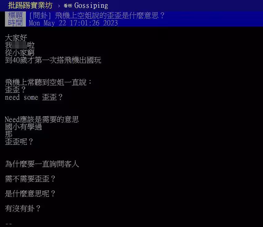 而常搭飛機或是語感好的過來人馬上就猜到空服員的原話:「wine?」、「白酒啦」、「歪歪笑死,White wine, ok?」其實人家空服員是詢問乘客要不要喝白酒:「Need some white wine?」白酒的英文「white wine」發音念快一點剛好就像「歪歪」,所以是原PO聽錯啦XD 你一開始就看出答案了嗎?還是也不小心想歪了呢?