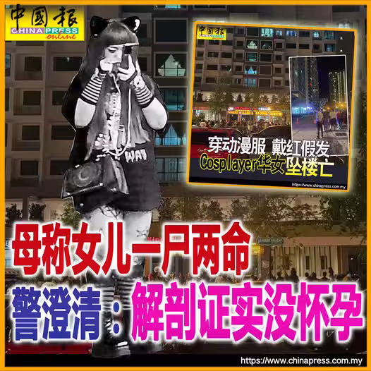 檳城4日訊)「Cosplayer華女墜樓亡」;警方今日傍晚澄清,指34歲女死者並沒懷孕。
