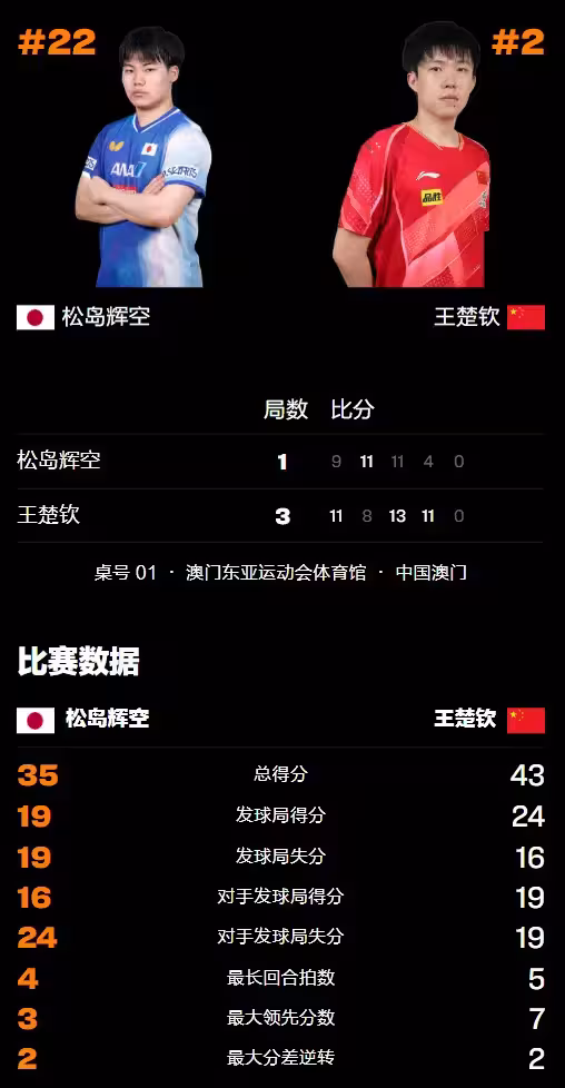 王楚欽(中國)3-1松島輝空(日本);