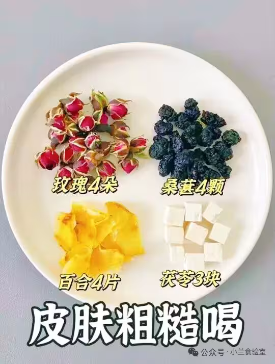▫️配方:玫瑰4朵(約1.2克)+桑葚4顆(約2克)+百合4片(約3克)+茯苓3塊(約2克)