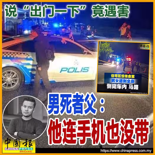 (峨占必叻12日訊)鉛縣雙屍命案,30歲男死者在事發前才回家並告訴父親要出門一下,連手機都留在家裡,但不久之後,警方就上門告知發生命案。