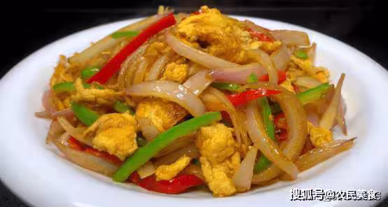 另起鍋,油熱後倒入蒜末和小米辣,用小火煸炒至蒜香出來,隨後加入洋蔥絲和青紅椒絲,開大火迅速翻炒均勻。
