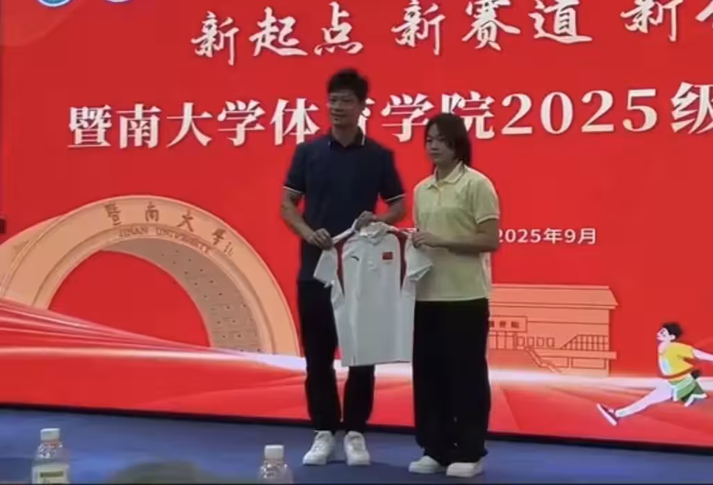 全紅嬋開學第一天有些緊張,24歲師姐陪伴一起,與院長蘇炳添合影