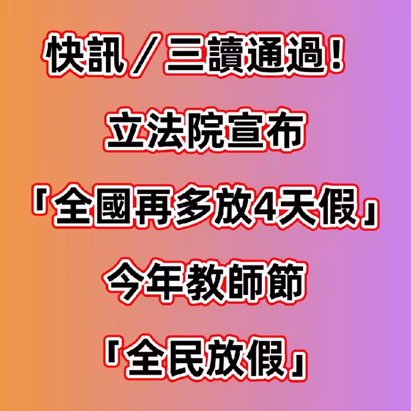 快訊/三讀通過!立法院宣布「全國再多放4天假」 今年教師節「全民放假」