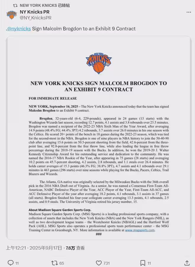 9月17日,尼克斯官方宣布簽下多名球員:和布羅格登、沙梅特、亞歷克斯-萊恩分別簽下一份Exhibit-9 合同。大家聽過Exhibit-10合同,被裁掉後最多能拿8.53萬美元。Exhibit-9 合同又是什麼?這兩個都是NBA合同的附加條款。