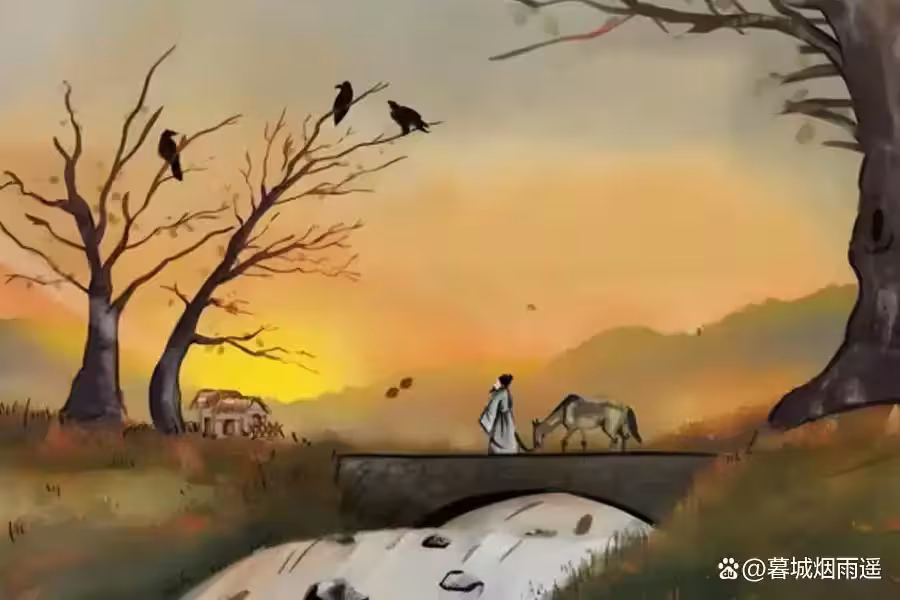 「枯藤」、「老樹」在古詩詞中自帶衰敗與淒涼的意象,是自然界的植物。「昏鴉」一詞,既可指黃昏時分的烏鴉,又可指因衰老而顯得暮氣沉沉,停留在「枯藤」與「老樹」之上的烏鴉,這裡寫的是活物。