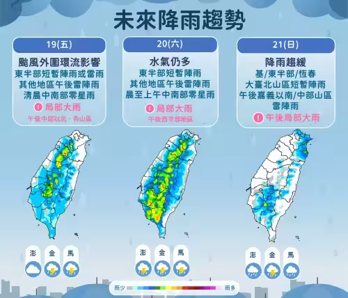 李名翔表示,下周一受到颱風直接影響,東半部、恆春半島整天有較大雨勢,桃園以北也有局部短暫陣雨或雷雨;下周二、下周三颱風最靠近台灣,宜花東、恆春半島降雨時間長,且雨勢升級到「豪雨」,南台灣也要注意大雨,中部以北雨勢影響較小,但也要注意強風。