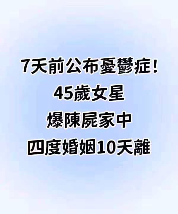 7天前公布憂鬱症!「女星爆陳屍家中」四度婚姻10天離