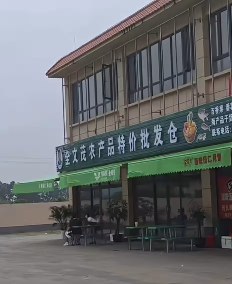 這家店鋪的名字叫做「全文茂農產品特價批發倉」,門頭上寫著:銷售各種熱帶水果、海產品乾貨、海產冰鮮、農副產品,等等。
