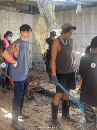 ▲加賀美智久和其他志工一起鏟泥。(圖/翻攝自Instagram/tomo_0612_)