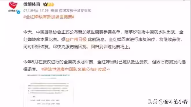 自從五月份傳出,全紅嬋因為舊傷復發退出冠軍賽後,網上就議論紛紛,本以為休息幾個月會參加七月份的新加坡世錦賽,沒想到也退出了比賽。