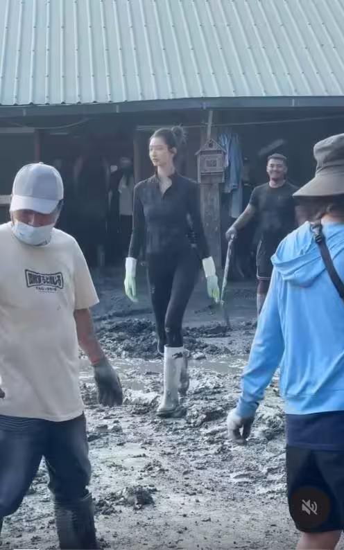 其中,現場出現一名高挑女子,與眾人一起清泥,氣場團結,特別分散亮眼。