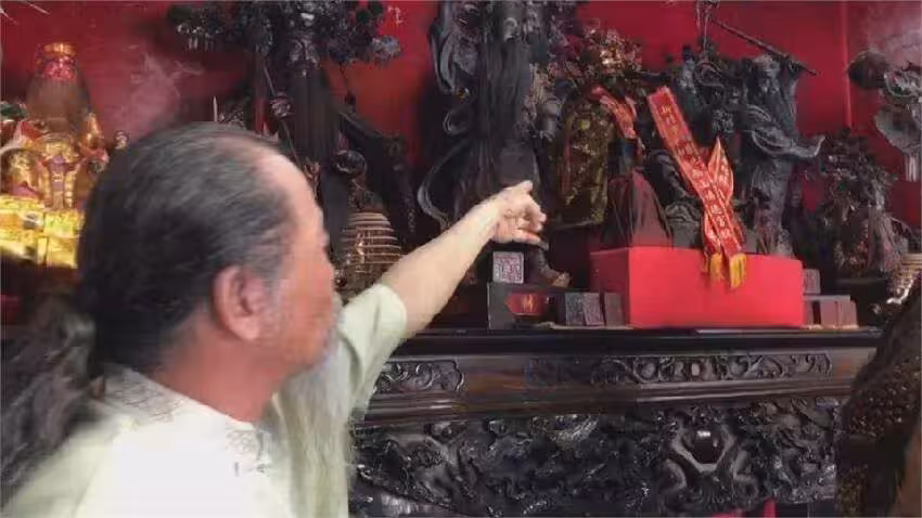 拿著香口中念念有詞,廟宇的蔡姓住持向土地公報告,三度託夢,交付的任務已經完成。