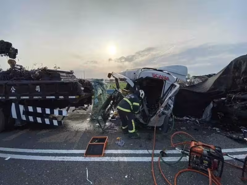 彰化聯結車猛撞停等紅燈大貨車! 車頭噴飛、駕駛受困救出