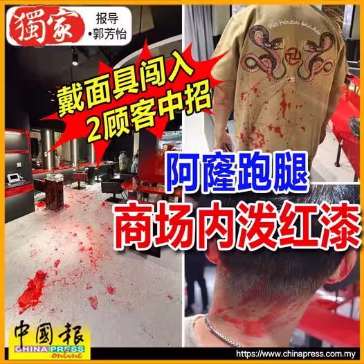 (新山12日訊/獨家報導)疑大耳窿跑腿膽大包天,直闖進熱鬧的購物商場,向購物商場內的理髮院潑紅漆,甚至還潑到兩名新加坡籍顧客!