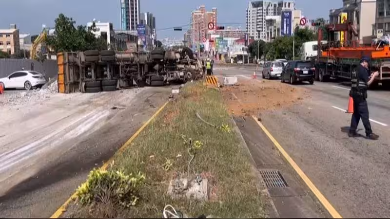 「砂石車剎車失靈!駕駛當機立斷自撞分隔島」台中向上路驚傳重大交通事故!36歲侯姓砂石車駕駛疑似剎車失靈,為避免撞上前方約10幾台停等紅燈車輛,選擇撞向分隔島導致車身橫向翻覆,車上載運的廢材砂石散落一地,所幸駕駛冷靜應對,對向車輛也迅速閃避,才沒釀成嚴重傷亡,目擊者直呼:「若沒有自撞,可能會連撞更多台車!」