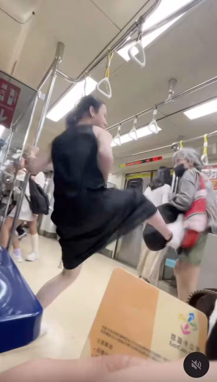被攻擊後,先將手上的提袋鄰座保管,併火大起身,並用右腳往老婦包包踢一腳,老婦也因此被踢飛到對面位置上。