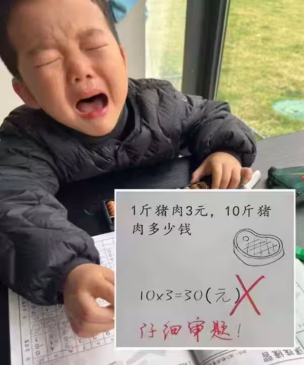 周五晚上,李媽媽發現兒子小浩的數學作業本上赫然打著一個紅叉,題目「一斤豬肉3元,十斤多少錢?」
