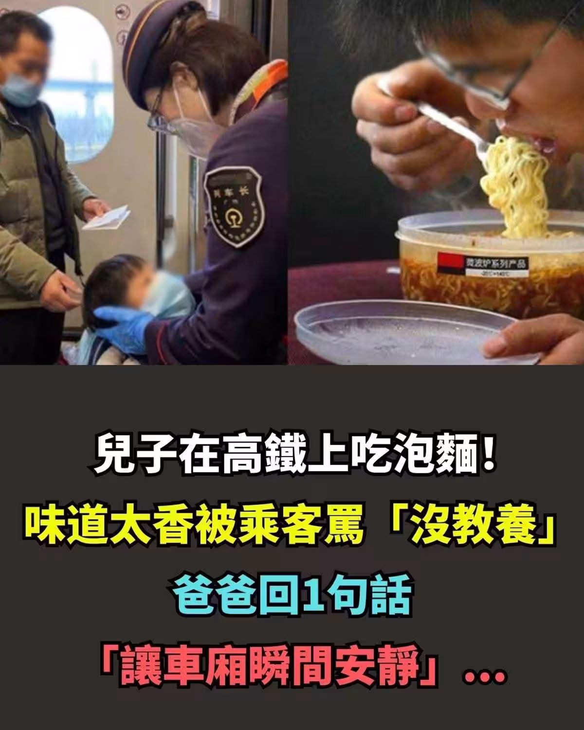 兒子在高鐵上吃泡麵!味道擴散被乘客辱罵「沒教養」爸爸回一句話「理性又霸氣」令其當場噤聲 !