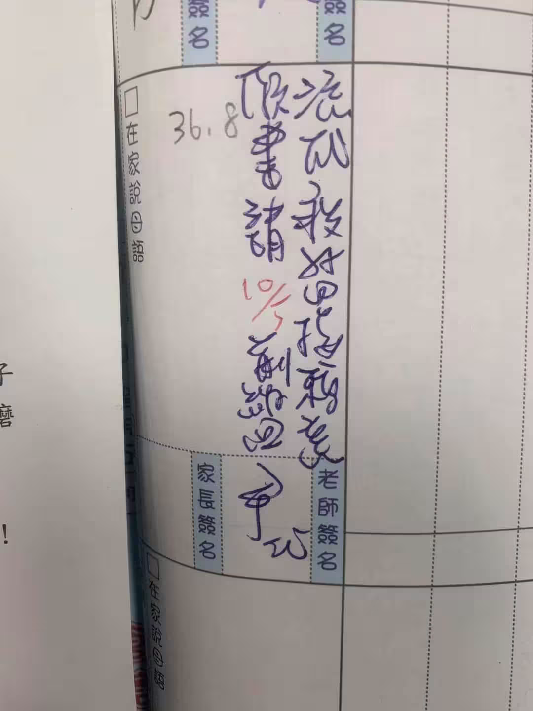 可以看到畫面中,聯絡簿上寫著一段話,但這一段話當中字體捲曲到不行,雖然上面有紅筆寫的10/5、以及旁邊寫著36.8的體溫紀錄,但乍看下依舊很難讀懂整句話想表達什麼,也難怪爸爸看了會如此想上網求救...