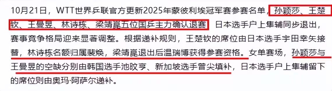 女單這邊,孫穎莎的空缺由韓國選手池旼亨補上,王曼昱退了之後,新加坡的曾尖頂了上來,日本的戶上隼輔退賽,奧瑪·阿薩爾拿了他的名額。