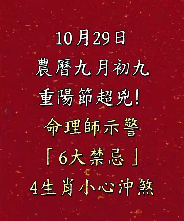 10月29日就是農曆九月初九重陽節,命理專家「清水孟國際塔羅小孟老師」特別點名4生肖,重陽節當天容易沖煞,外出需格外謹慎。